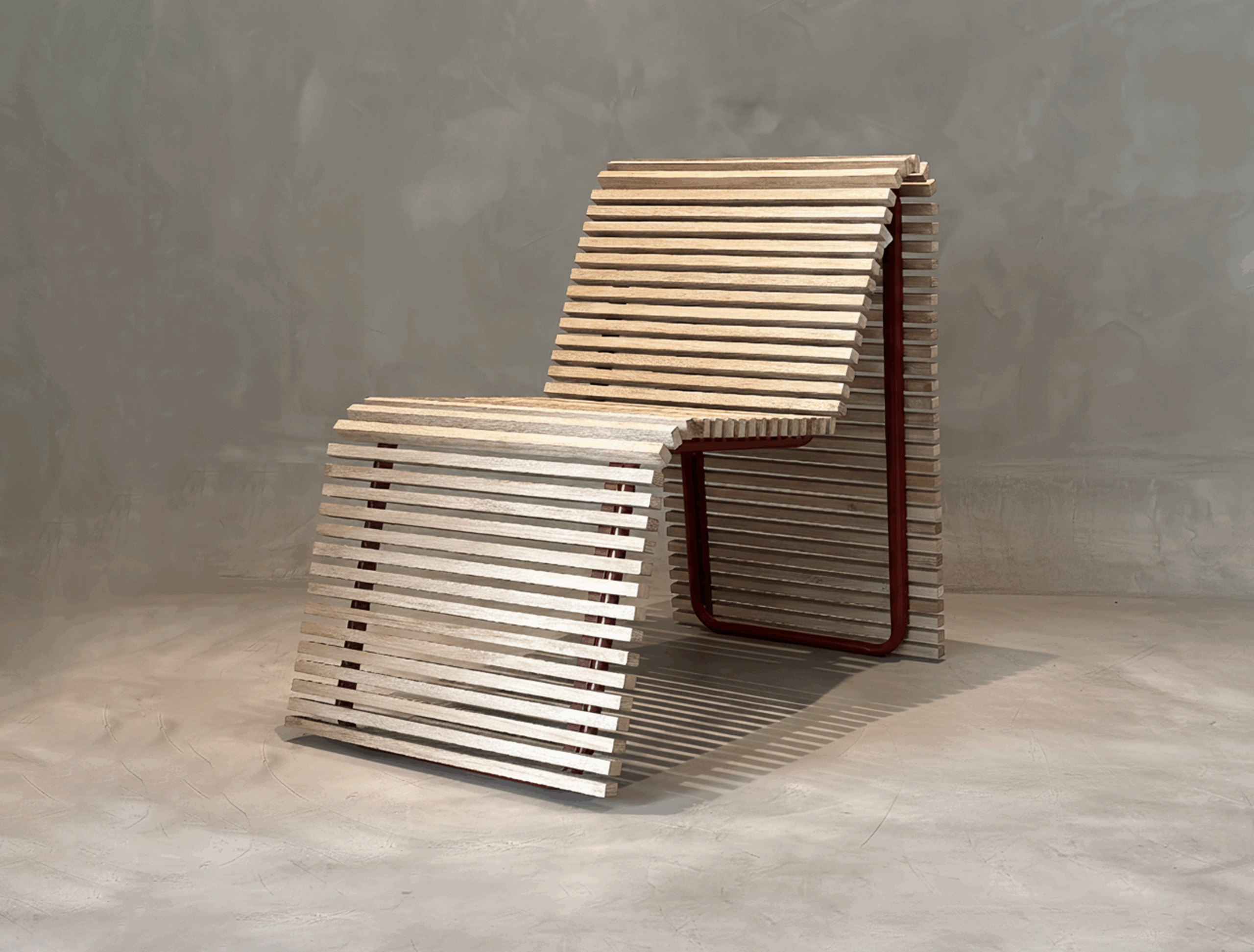 Tubería metálica color jitomate + madera natural + colchoneta en tela monaco y ribete en habanna