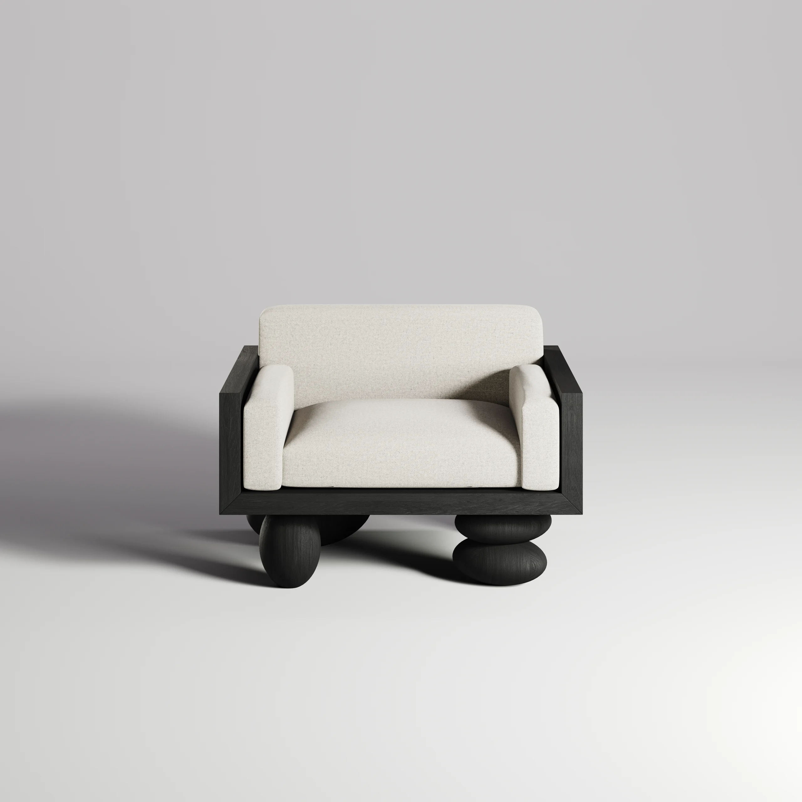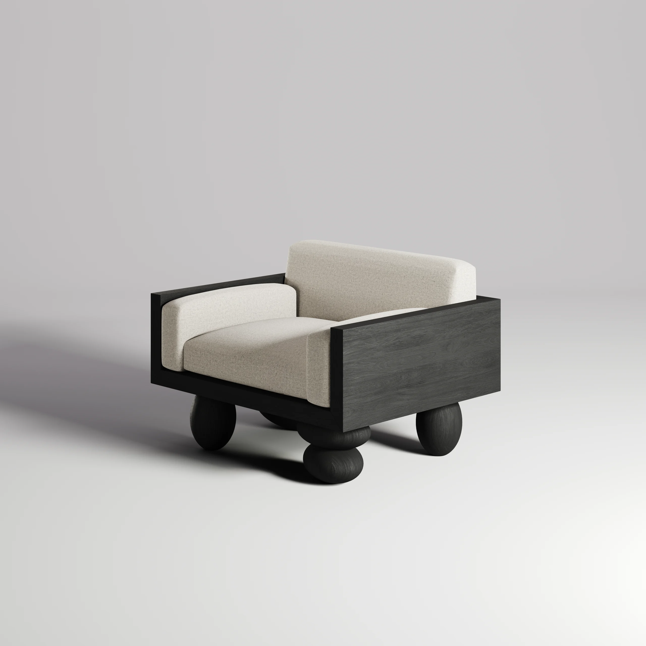 Estructura en madera natural grateada con acabado en pintura poliuretano + tapizado en tela de interior